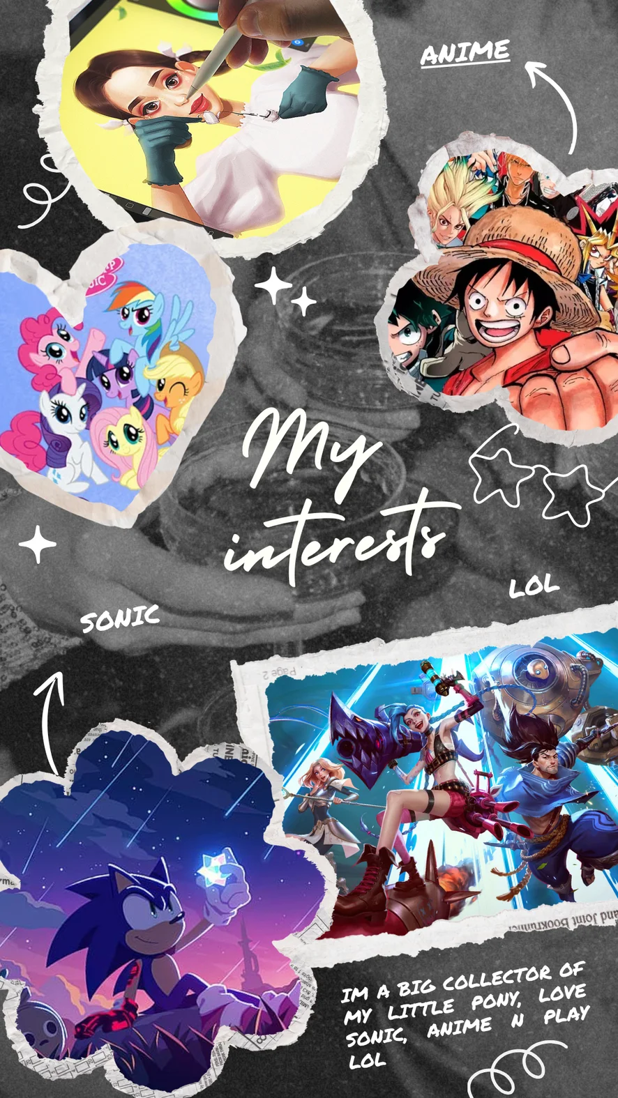 Hi im a funny a person who likes art and anime, I love make handmade, I love animals and talking a lot so much, I can talk about everything. I like graffitti, art, music, cosplay, collect a lot of toys and videgoames.